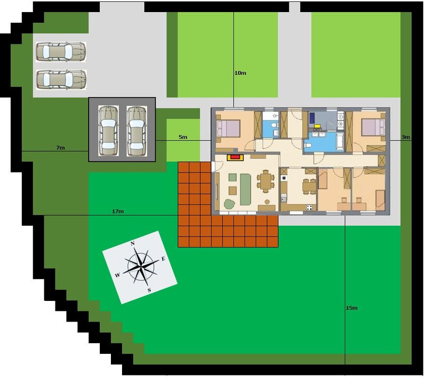 Cześć. Która wersja zagospodarowania działki jest według was lepsza? Działka to w przybliżeniu kwadrat 36 x 36. Z lewej strony jest cicha droga osiedlowa a z prawej jest sąsiad. Ogród wychodzi na południe. Na działce przewidziana jest podwójna wiata garażowa oraz 2 dodatkowe miejsca postojowe. Dom to parterówka 15 x 10 metrów. Ciemny zielony to zieleń wysoka (żywopłot, iglaki itp.). Jasny zielony to krzewy dekoracyjne. Zielony zielony to trawnik Opcja 1. Dom zbliżony na maxa do lewej granicy (max to 6 m zgodnie z MPZP). Dzięki takiej opcji zyskujemy taras który po południu będzie zacieniony. Opcja 2. Dom (lustro) na maxa zbliżony do prawej granicy. Zyskujemy trochę więcej ogrodu ale taras jest bardzo nasłoneczniony. Z północnych sypialni jest widok na ogród. Auta są daleko. Opcja 3. Źle, źle, źle. Już piszę jak ma być