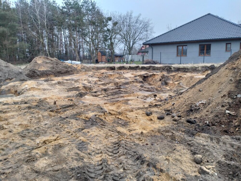 Budowa 25.03.2025 Dzisiaj skończyli ściągać humus (ok 410m2) oraz wywozić resztę nasypu - łącznie wyszło 22 wywrotki po 20t (czyli lepiej niż się spodziewaliśmy). Teraz równanie terenu i w tym tyg. ekipa będzie uzupełniać dziury (tam gdzie woda to kamień + piasek). cdn... -