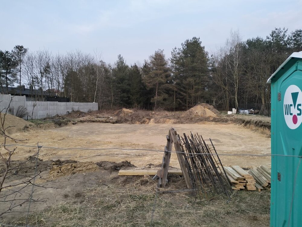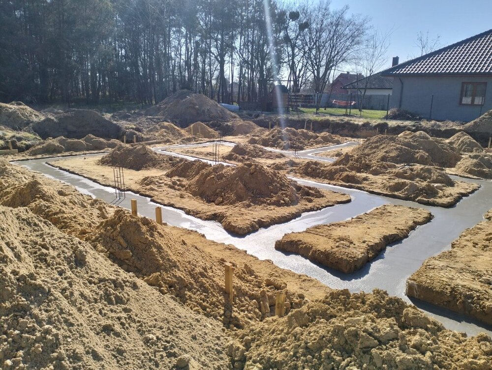 Cześć wszystkim, zamierzam w tym wątku dzielić się swoimi doświadczeniami przy budowie domu która właśnie ruszyła (z wielkimi problemami już od pierwszej łopaty ale to zaraz). Działka kupiona 2024r, 1074m2, z wjazdem od zachodu, tarasem od wschodu (celowy wybór). Dodatkowo działka jest pośrodku osiedla domków jednorodzinnych przy drodze prywatnej (to minus akurat). Działka była dość droga ale niestety takie są ceny w tej okolicy (270 zł / m2). Dostęp do gazu, wodociągu oraz ze skrzynką elektryczną na działce. Kupiliśmy projekt ua245 + uzyskaliśmy pozwolenie na budowę w 08/2024r. Międzyczasie zleciłem ogrodzenie działki (tylko od frontu). Kolejnym krokiem było znalezienie ekipy do SSO oraz kierownika. Udało się, szef ekipy bardzo komunikatwny, umowa, harmonogram, wycena ok więc termin rozpoczęcia ustalony na 03/2025. Kierownik całkowicie niezależny, wporządku. Projekt to uA245 po sporych zmianach ale będzie to: - parterówka ze stropem z wiazarów - 143m2 + 7 kotłownia + 38 garaż w bryle (2st) - ogrzewanie gazowe (mam umowe) - rekuperacja / podłogówka wszędzie - usunięty wysoki sufit w salonie, wszędzie będzie normalny (2.7+-) - wiązary (350m2) Badanie gruntu odziedziczyłem po poprzedniku ale jego domek był nieco mniejszy. Na działce występuje nasyp niekontrolowany od 0.3m - 0.9m - więc ta warstwa będzie do wywiezienia. Później piaski. Wody gruntowe 1.4-1.7m Na działce zamontowałem kamerę ponieważ mam aż godzinę drogi do niej i nie mogę być na zawołanie i chcę wiedzieć czy coś się dzieje. Wodę mam od sąsiada, a prąd swój. Toaleta zamówiona, jakiś blaszak też jest. BUDOWY CZAS START: 18.03.2025 Geodeta wyznaczył wykop (dom + 2m rezerwy, 3/4 działki praktycznie do rozkopania) BUDOWA 19.03.2025 Koparkowy wpadł i zaczął od końcowej ściany/narożnika i idealnie wbił się w nasyp o którym nie mieliśmy pojęcia więc wykopał ten syf aż do wód gruntowych / piasku. Oczywiście od razu zadzwonił do mnie i poinformował, że dramat. Później razem z wykonawcą ściagali dalej humus i im po prostu są punkowe miejsca gdzies jest właśnie taki nasyp jakby ktoś 30 lat temu wybierał piasek i wrzucał tam syf. Zorganizowaliśmy spotkanie następnego dnia 20.03.2025 na 7:00 - ja, kierownik oraz wykonawca. BUDOWA 20.03.2025 Wody naszło dość sporo (zdjęcie wyżej to było apogeum, teraz opada). Było kilka pomysłów (pompowac, iglofiltry etc) ale po prostu zamówiłem w tym samym dniu geotechnika który przyjechał, posprawdzał i stwierdził, że wystarczy zasypać to kamieniem i następnie lecieć zwykły piaskiem. Reszta działki wygląda względnie ok, czyli tak jak to przewidywaliśmy ale wymian gruntu może być nieco więcej. BUDOWA 22.03.2025 Z racji tego, że humus to tak naprawdę 30letni nasyp to trzeba to wywieźć i z tym oczywiście były problemy nie ma chętnych na przyjęcie tego czegoś (ziemia, kamienie, szmaty, wszystko). Całe szczęście udało się znaleźć kogoś kto będzie nam to wywoził/utylizował. W piątek zostało wywiezione 10 x 20t. To co się nadaje będzie odkładane na koniec działki. Prognozujemy, że może być jeszcze z 20 wywrotek po 20t. Po ściągnięciu całego humusu i wymianie punktowe gruntu będziemy wzywać geotechnika w celu weryfikacji czy ekipa dobrze przygotowała podłoże pod ławy. Przed budową udało mi się zarezerwować wiązary (350m2), wycenić pokrycie (materiały), zarezerwować dekarza oraz wycenić okna z żaluzjami fasadowymi. Projekt wnętrz zamówiłem w styczniu i w ciągu kilku dni dostanę finalne wizualizacje/rzuty/dokumentacje oraz listę zakupową. Dzieje się dużo dobrego i kilka komplikacji ale jeśli to jest do przeskoczenia to damy radę! ps. rodzina 2+2 (przedszkolaki)