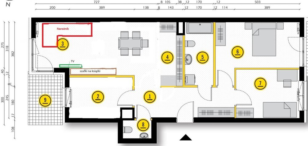 1. Witam serdecznie, Chciałbym poprosić o pomoc w ustawieniu mebli w salonie z aneksem o dość ciężkich do ogarnięcia wymiarach: długość: 878 cm w tym: - 200 cm o szerokości 275 cm (zaraz przy oknie) - 389 cm o szerokości 318 cm (centralna część pomieszczenia - 289 cm o szerokości 382 cm (wejście + aneks kuchenny) Zależy mi na umieszczeniu tv centralnie do osi kanapy (kino domowe) i stole najlepiej 160 minimum 140cm (oba z opcją rozłożenia w razie potrzeby) Na zdjęciu naniosłem swoje plany ale z chęcią poznam jakieś inne ciekawe pomysły. Dzięki i pozdrawiam