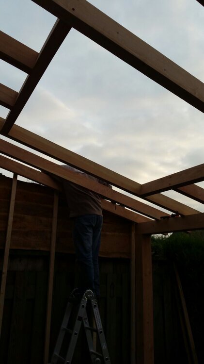 To nie jest dziennik budowy ale pozwolę sobie relacjonować postęp prac. Idzie dość wolno bo pracujemy i tylko w weekendy możemy coś zdziałać. W zeszłym tygodniu zakupiliśmy deski modrzewiowe na ścianki boczne i daglezji na pokrycie daszku. Drzewo było surowe, musimy je oszlifować. Deski daglezji są już oszlifowane. Niestety drzewo modrzewiowe do budowy ścianki bocznej jest mokre. Oszlifowaliśmy tylko kilka niezbędnych do rozpoczęcia prac, reszta schnie. Dzisiaj wykończyliśmy jedną z zewnętrznych części - od strony ogrodzenia z sąsiadami. Zamontowaliśmy to na konstrukcji z kantówki 5x5 pomiędzy którą damy płyty z piankę PIR i od wewnątrz też wyłożymy modrzewiem. Drzewo ma cudowny kolor. A jak pachnie... Tak to wygląda od środka. Czekam aż dojdą zamówione stalowe okienka, które zamontuję od środka (będą to "ślepe", spełniające funkcję dekoracyjną jedynie okna). Natomiast w dachu umieścimy duże okno dachowe velux'a.