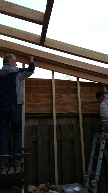 Kolejny weekend i prace poszły trochę do przodu. Położyliśmy dzisiaj deski z daglezji na daszek, przygotowaliśmy- przeszlifowaliśmy deski na ścianki boczne: Dotarły różne zamówione materiały: folia epdm, klej do niej, specjalne śruby. Taśma ołowiana ryflowana do wykończenia komina i łączenia z murem ( grill, który będzie wewnątrz) właśnie jedzie z Polski. Zamówiłam też tutaj w Holandii specjalną taśmę pod kontrałaty. Boję się nieszczelności, przecieków, grzybów, plesni i innych konsekwencji zaniedbań. Teraz męczy mnie problem czy przy tym typie dachu (niski spad około 12 %), i tym pokryciu - deski na krokwiach, folia budowlana, izolacja z płyt PIR, membrana, kontrałaty i łaty a na to blachodachówka, które zastosuję dach ma być otwarty, w sensie zostawić folię naciętą u góry i nad tym na łatach jeszcze jeden pas folii ? Czy przykryć gładką jednolitą powierzchnią? I czy dać wróblówkę z przodu przy okapie? Blachodachówka ma takie właściwości, że osadza się na niej para wodna, skrapla się na membranę, czy można jakoś temu zaradzić?