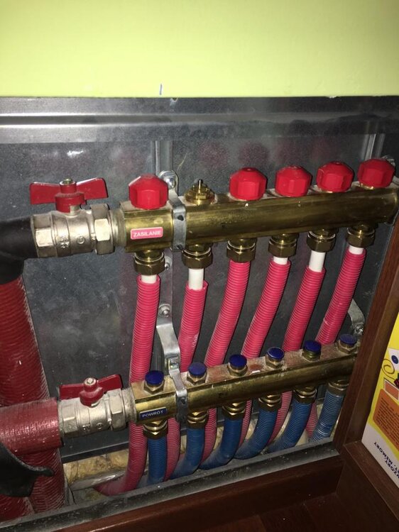 Wracając do tematu sporego zużycia prądu , zużycie w grudniu dla całego domu to 2000 kWh - sporo wg mnie , oświetlenie w całym domu wymienione na energooszczędne , kuchenka elektryczna i piekarnik używane normalnie , boiler 300 l grzany tylko przez PC - nastawiona temp wody w boilerze to 50 C . Niestety nie mam jak narazie osobnego miernika zużycia faktycznego przez PC ,ale praca 17 godzin na dobę daję trochę do myślenia . Zastanawia mnie dlaczego w jednym pokoju jest temperatura 22-23 stopnie , gdzie w pokoju obok jest 18-19 stopni . Na rozdzielaczach nie posiadam termostatów , jedynie co mogę pokręcic tak sadze to na belce powrotnej są zawory dławiące.