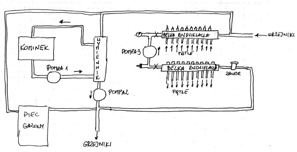 Drogi Kaizen. Rysunek stanu docelowego jednak różni się od mojej instalacji, ponieważ pompę mam po drugiej stronie, czyli ciepła woda wpływa najpierw do dolnej belki, przepływa przez wloty do podłogówki, a dopiero potem dociera do pompy. Dodatkowo, że nie mam tej rurki równoległej do pompy łączącej belkę górną z dolną. Na Twoim rysunku woda wpływa z górnej belki do podłogówki. U mnie wydaje się to niemożliwe. Jak włączę tę pompę, to woda popłynie w większości do powrotu. Popraw mnie jeśli moje myślenie jest błędne. Wg mnie to działa z założenia u mnie to tak. na początku wpływa ciepła woda z prawej strony i większość wpływa poprzez dolną belkę do podłogówki, jakaś mała część tej wody mimo wyłączonej pompy przepływa przez nią i leci do powrotu (górnej belki). Czujnik temperatury włączający pompę bada wodę wpływającą i jeżeli jest za gorąca, to pompa się włącza i wtedy duża część wody płynie od razu do górnej belki. U mnie nie widzę, jak miałaby się woda mieszać. Na Twoim rysunku tak, ale u mnie gdzie? Pozdrawiam