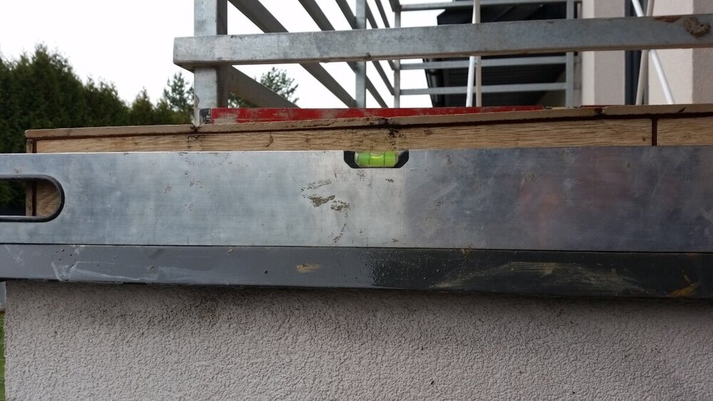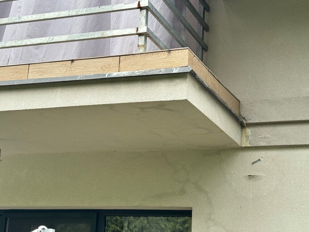 Przed ułożeniem płytek już była wymyta część elewacji przy łączeniu z balkonem. Z drugiej strony balkonu okapnik ma dobry spadek i tego problemu nie ma. Jak robiłem hydroizolacje od czoła balkonu zanim położyłem płytki to posadzka lekko wilgotna na łączenie z okapnikiem mimo, ze sama posadzka była sucha. Już wtedy ewidentnie był problem.