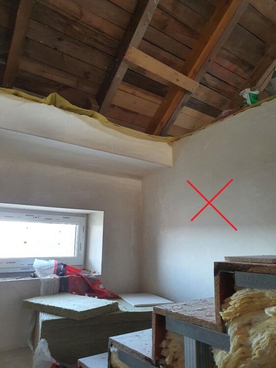 Witam Otóż kilka miesięcy temu położyłem na posadce betonowej folię paroizolacyjną, a na niej wełnę 25cm. Z różnych przyczyn wełnę położyłem tylko na części strychu. Jako, że zbliża się zima, chciałem dokończyć układanie wełny. No i niestety jak wczoraj wszedłem na strych to pod folią zobaczyłem kropelki wody. Z przerażenia odkryłem część wełny, i okazało się, że tam gdzie jest wełna nie ma wody. Woda pod folią jest tylko w miejscach gdzie nie zdążyłem ułożyć wełnę. 1) Czy to normalne zjawisko? Tzn. rozumiem, że ciepłe powietrze idąc do góry spotkało folię na zimnym strychu i dlatego było skraplanie, a tam gdzie ułożyłem ocieplenie nie było różnicy temperatur i jest OK 2) Jak pozbyć się wody? Czy mam naciąć folię poczekać aż odparuje, zakleić i ułożyć wełnę. Czy też, od razu ułożyć wełnę, a wilgoć z potem sama wyjdzie np. do pomieszczeń poniżej, (problem w tym, że na razie mam słabą wentylację, a rekuperację w domu uruchomią na przełomie marca/kwietnia 3) Wejście na strych nie jest w postaci włazu, tylko normalne schody + ocieplone drzwi oddzielające strych od ogrzewanych pomieszczeń. Tak nad schodami mam dziurę ok. 4,5m2. Pytanie jak ją zaizolować. Myślałem nad tym aby zrobić lekką, zdejmowalną konstrukcję, a na niej ułożyć styropian. Tylko, że wtedy ten mały kawałem będzie szczelnie zamknięty i będzie brak wentylacji= skraplająca się woda, z drugiej strony, jak nie zaizoluje dziury to powstanie mostek termiczny (na zdjęciach zaznaczyłem czerwonym "X" ściany do pokoi). Znajmy mi polecił, aby zrobić tą konstrukcję, i w dwóch miejscach zrobić otwory np. fi50, w ten sposób wilgoć będzie miała ujście na strych. Co o tym sądzicie?