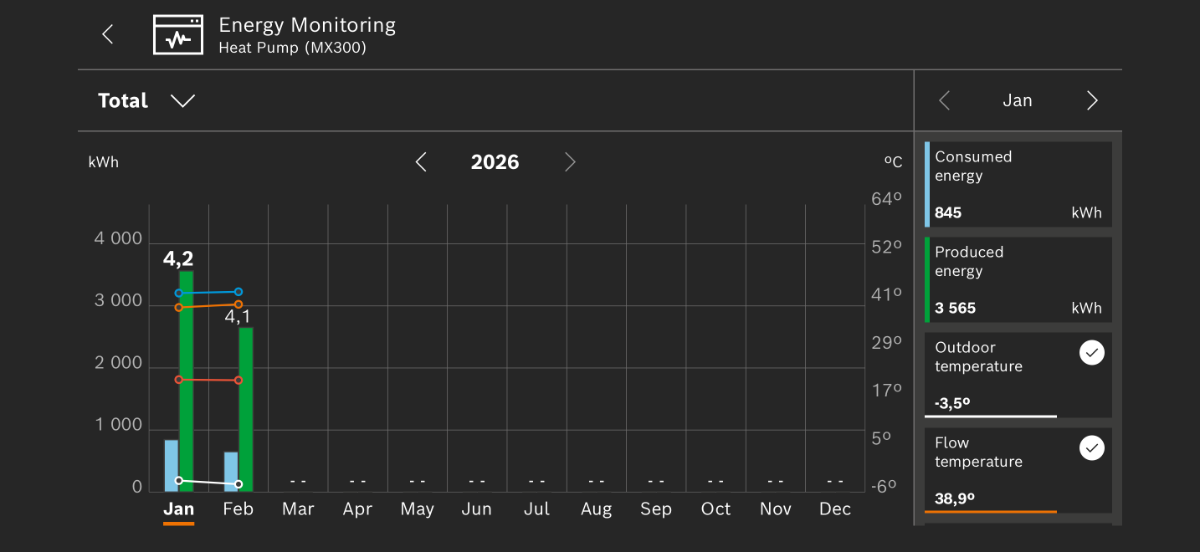 styczeń - zużycie prądu: 574 kWh - produkcja ciepła 2766 kWh - COP 4.8 - średnia temp w pomieszczeniach 20.3*C - średnia temp dolnego źródła (grunt) ok 7.5*C - średnia temp zasilania (wyjście z pompy) ok 37*C (31-39*C) Temperatura na grzejniki jest mniej więcej taka sama co wyjście z pompy z dokładnością do 0.3*C. Przy czym mam też różnicę wskazań pomiędzy grzejnikami...