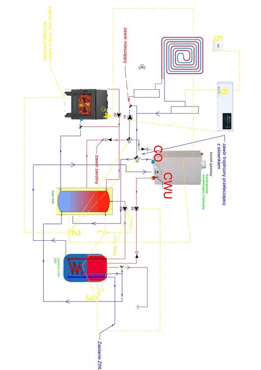 Poniżej przesyłam schemat do oceny poprawy w połączeniu dwóch źródeł ciepła kominek z płaszczem w układzie zamkniętym + piec gazowy + bufor + zasobnik CWU.