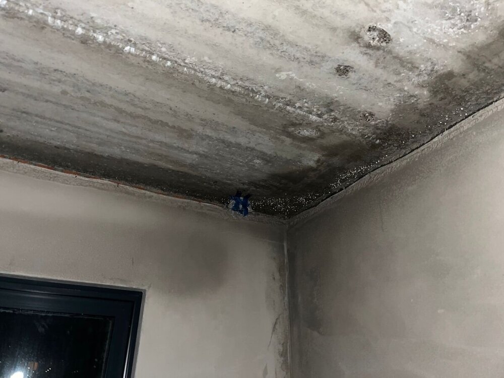 pod koniec października ekipa skończyła kładzenie tynków cementowo wapiennych (były wietrzone). Czy jest możliwe, że przy obfitych opadach w miejscu gdzie są lane słupy i podciągi tynk robi się mokry, czy jest możliwe żeby żelbet aż tak pił wodę? Dodatkowo jak na załączonym zdjęciu od ścian zewnętrznych strop jest mokry i skrapla się na nim woda, czy to też może być związane z opadami (nie pamiętam, żeby takie zjawisko miało miejsce przed wykonaniem tynków mimo opadów)?