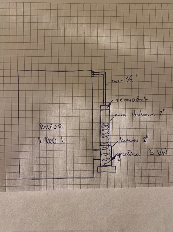 Planuje montaż bufora 2000 l w kotłowni, którego będę ogrzewał kotłem na drewno. Dodatkowo do jego ogrzewania planuje wykorzystać nadwyżki energii elektrycznej z pv. Grzałka 3 kW będzie grzać od 0 min. do kilku godzin dziennie. W zależności od nasłonecznienia. Falownik zaprogramowany tak ze załącza grzałkę po przekroczeniu zadanej mocy ( ok południa, kiedy świeci słońce). W tym celu chce dorobić taki mini kociołek elektryczny z kolanek, rury stalowej i umieszczonej w nim grzałki, do podgrzewania wody gdy jest słonecznie. Kociołek będzie miał zasilanie z dołu bufora a ogrzaną wodę oddawać ma na górę. U góry nad grzałką znajdować ma się termostat ( myślałem o zwykłym samochodowym) który będzie wypuszczał wodę dopiero po jej ogrzaniu. Dzięki takiemu rozwiązaniu ogrzeje mniejszą ilość wody ale do temperatury jaką bede mógł wykorzystać do ogrzewania,a nie tylko podniosę temperature połowy bufora o kilka stopni jak miałoby to miejsce gdybym wstawił grzałkę do wewnątrz bufora np. w połowie jego wysokości.
