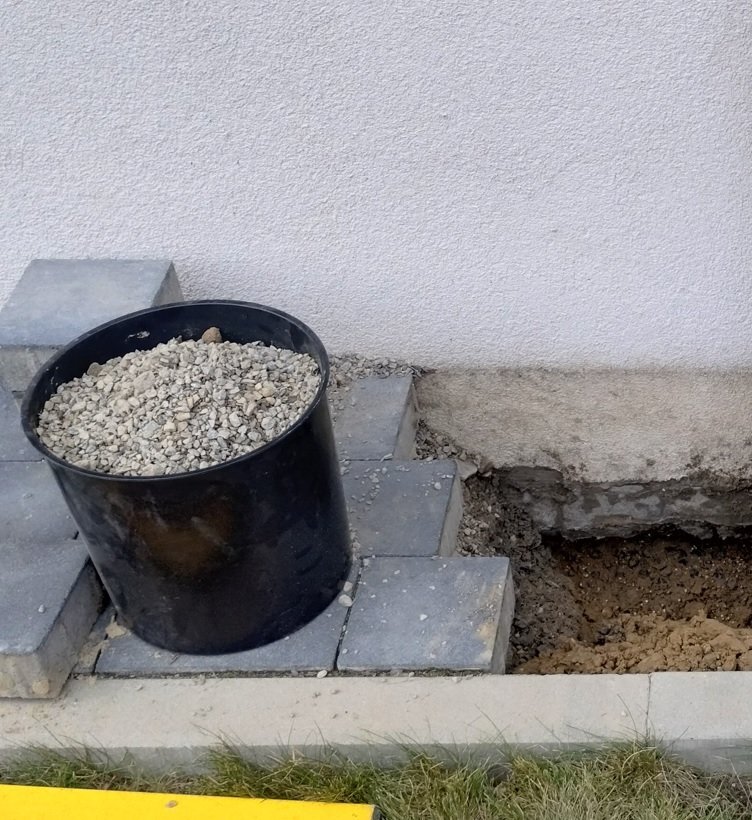 1. Nie wiem, czy to w czymś pomoże. Zrobiłem Aktualne foto tak jak prosiłeś. Łatwo porównać poziomy na podstawie umiejscowienia skrzynek. Tak jak pisałem wyżej - woda podeszła dokładnie pod tą ścianę na ok. 5 cm powyżej krawężnika. Na zbliżeniu zauważyć można spękaną elewacje przy kostce, która poprawiana była już wczesniej (Nie rozbierano kostki przy tym). Dodatkowo zrobiłem wykop przy innej ścianie by zobaczyć jak to wygląda pod spodem. No fotkce widać folie kubełkową, która dosunięta jest do styropianu (nie jest niczym przytwierdzona ipt. - można ją swobodnie odchylić). Podsumowywując, wg mnie problem leży w braku izolacji pionowej, która wg planów powinna być zrobiona do wysokości 30cm ponad poziom gruntu. Zamiast tego. ekipa przykleiła styropian na gołe pustaki. Also Big Thanks to Naomi Ross for detailed explanation.