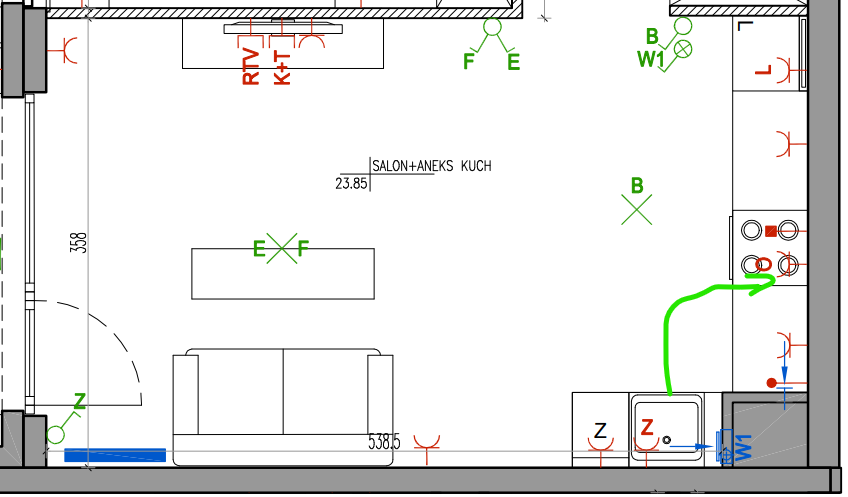 Chciałbym przenieść zlew na ścianę wskazaną strzałką, oczywiście musiałbym tam poprzesuwać trochę rzeczy. Z czym takie przeniesienie będzie się wiązało? Czy rury kanalizacyjna i z wodą będą wtedy puszczone w podłodze? Czy po ściance pionu i będzie to musiało być zabudowane? Czy po prostu można zrobić wyprowadzenie wody i kanalizacji od strony z której chciałbym mieć zlew? Nie bardzo się orientuję jak się przenosi przyłącza wody i kanalizacji więc będę wdzięczny za pomoc.