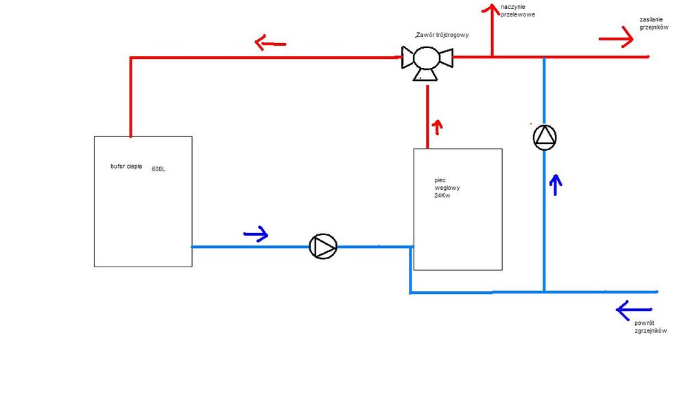 WItam dom ma 75m2 parterowy ocieplony w miare . Piec jest stary przewymiarowany bo az 24Kw i ( w domu 6 x grzejnik żeliwny po 7 żeber ) ale posiadam zbiornik 600L i mam zamiar wykorzystac go jako bufor bo mase ciepła sie marnuje . Wymyśliłem takie połączenie wszytskiego w całośc jak widac w załączniku . Prosze o uwagi i sugestje jak rozwiazać to lepiej trzymajac tego ze ma byc tanio / 2 pompy mam na stanie + zawór trujdrogowy mieszający