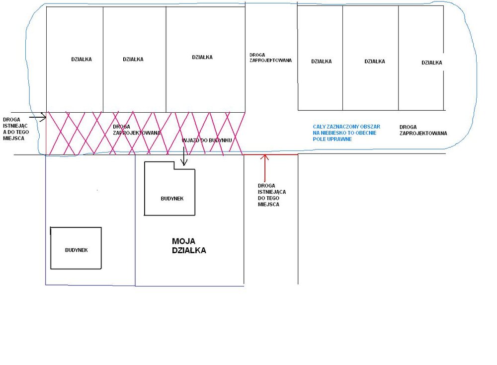 Witam Wszystkich Mam pewien problem do rozwiązania do posta załączam mapkę, która odzwierciedla mój problem Mianowicie mam działkę i dom pobudowany na niej tak jak na rysunku działka jest narożna z jednej strony działki mam istniejącą drogę jednakże budynek mój ma wjazd i wejście od strony drogi zaprojektowanej, ale jest to pole uprawne. Cały obszar zaznaczony na niebiesko jest podzielony na działki i ma wyznaczone drogi, ale jest to pole uprawne. Problem polega na tym, iż właściciel całego obszaru zaznaczonego na niebiesko nie zgada się na to abym sobie zrobił tam dojazd (zaznaczony krzyżykami na mapie na czerwono) tłumacząc się, że dojazd do działki posiadam. Dodam, iż swoją działkę kupiłem właśnie od niego. Jedyne co mi zaproponował to to, iż sprzeda mi fragment zaznaczony krzyżykami i będę mógł sobie dojeżdżać. Dodam jeszcze to iż jesienią 2010 r. zakład energetyczny w drodze zaprojektowanej zakopał kabel energetyczny i postawił kilka skrzynek na tym polu uprawnym tak jak są zaprojektowane drogi. Od znajomego dowiedziałem się że zażądał on odszkodowania od zakładu energetycznego, że mu pole skopali (zamiast się cieszyć iż wszystkie działki mają praktycznie prąd doprowadzony i wartość wzrosła ). Żadnej z tych działek w obszarze niebieskim nie sprzedał. Teraz mam pytanie skoro droga została zaprojektowana i swoje pole podzielił na działki to czy mogę sobie zrobić tam drogę czy nie? Jeżeli coś opisałem niedokładnie to pytajcie