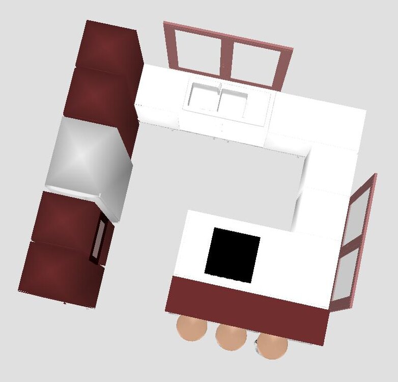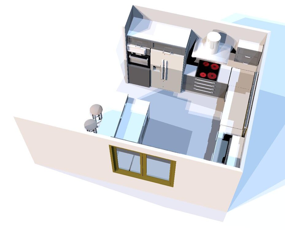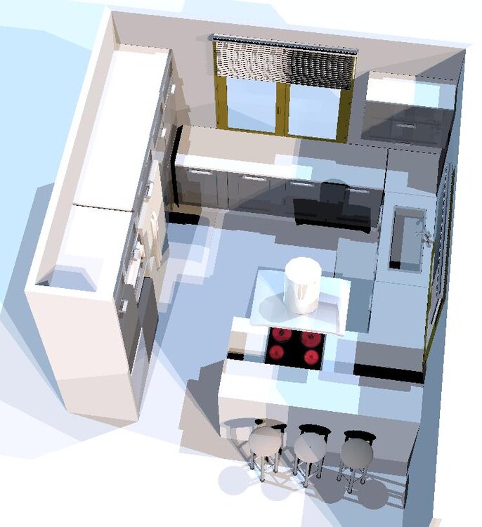 Przpraszam, teraz powinno być chyba lepiej widać To jest kuchnia z zamienioną lodówką z cargo, z trzema 60tkami pod oknem czyli do wyspy odległość od blatu przy drugim oknie 180 mc, ale zlew przeniesiony na blat bliżej płyty.