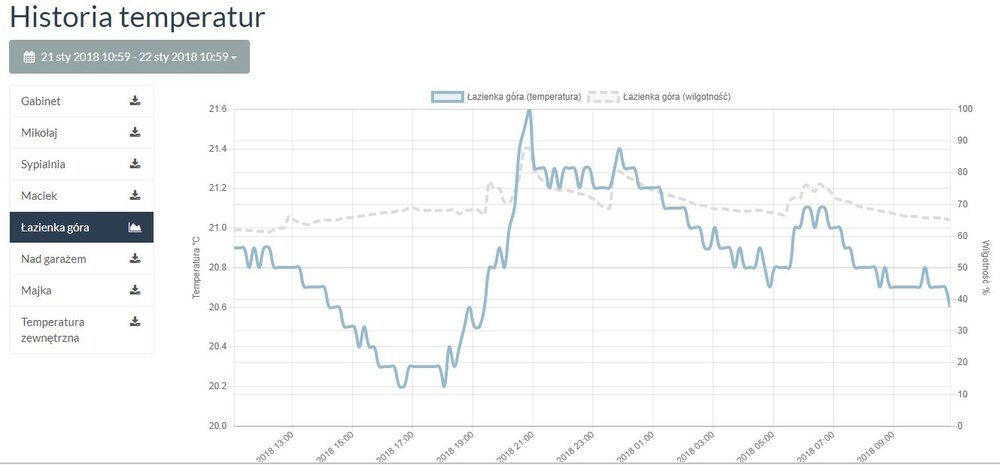 Co do podłączenia do Victrixa może nie być łatwo, nie spotkałem nigdzie opisów protokołu komunikacyjnego, ale też nie szukałem zbytnio więc może to ktoś już ogarnął. Jeśli chodzi o moje sterowanie srefowe to zastosowałem 7 urządzeń SONOFF TH10 oraz CARV2. CAR trzyma pogodówkę, c.w.u oraz działa jako termostat pokojowy w jednej ze stref (salon, jadalnia, kuchnia). W pozostałych strefach zamotowałem termostaty TH10 sterujące głowicami termostatycznymi na rozdzielaczach. Na etapie budowy położyłem okablowanie z każdego pomieszczenia do szafek rozdzielaczy. Dzięki temu nie musiałem wchodzić w termostaty bezprzewodowe. Dodatkowo ponieważ SONOFFy mają możliwość podłączenia do sieci poprzez WI-FI można nimi zarządzać poprzez aplikację ze smartfona. Istnieje również możliwość wymiany oryginalnego firmware'u na alternatywny - co uczyniłem. Alternatywny soft (Supla) daje szereg dodatkowych możliwośći plus jest gromkie grono pasjonatów tworzących bardzo ciekawe oprogramowanie na te urządzenia. W efekcie termostatami można zarządzać zarówno z przeglądarki, jak również z telefonu, Aplikację można zainstalować u siebie lub na serwerze w chmurze, jedną z ciekawszych funkcjonalności jest rejestrator temperatury w każdym z monitorowanych pomieszczań - temperatura zrzucana jest do bazy co 5min - rewelacja, na podstawie odczytów można wręcz perfekcyjnie zestroić załączanie i wyłączanie ogrzewania w każdej ze stref aby uzyskać maksymalny komfort. Załączam zrzut z przykładowego odczytu w jednym z pomieszczeń. -