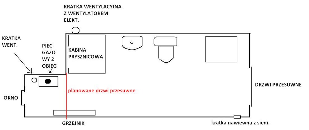 Witam. Sytuacja jest taka, że przejąłem mieszkanie w kamienicy po strasznych niechlujach i po kolei staram się naprawiać szkody. Jestem na etapie planowania prac remontowych w łazience. Na załączonym rysunku przedstawiłem schemat łazienki. Czerwona kreska to planowane drzwi przesuwne, które będą odcinać część "gospodarczą" od części używanej na co dzień. W części gospodarczej planuję dać pralkę i dwu obiegowy piec, który już tam jest. Moje pytanie brzmi jak prawidłowo zrobić tam wentylację, aby i piec miał odpowiedni dopływ powietrza i w łazience wentylacja działała sprawnie. - Czy ta kratka wentylacyjna która jest koło komina jest potrzebna? czy piecowi wystarczy sam komin? - czy muszę wykonywać osobny nawiew do pieca po montażu drzwi między przestrzenią gospodarczą od codziennej, czy wystarczy np montaż nawiewnika w oknie, lub jego rozszczelnienie. - dla mnie pewnym jest, że muszę wywalić ten elektryczny wentylator znad kabiny prysznicowej - jeżeli się mylę - proszę pisać.