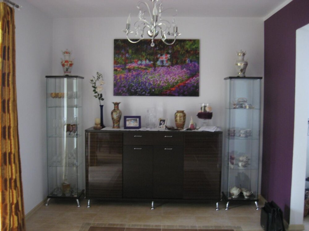widok na komodę w jadalni stół i krzesła (docelowo będą stały obok komody) kanapa już zamówiona (chesterfield w obiciu z szarego pluszu) wiatrołap i widok na garderobę -