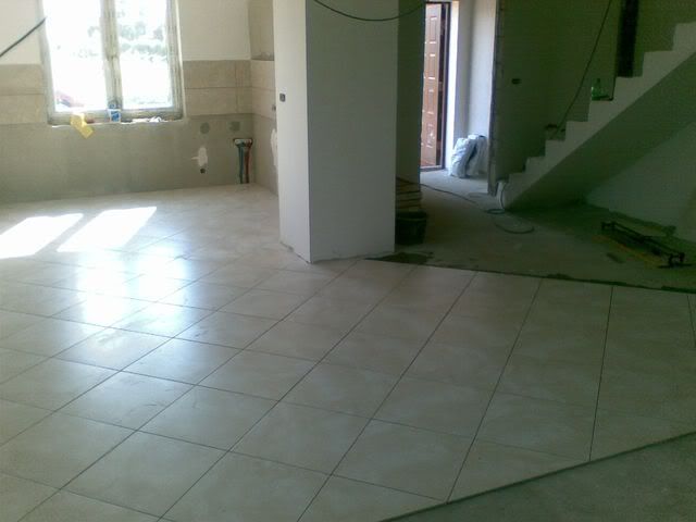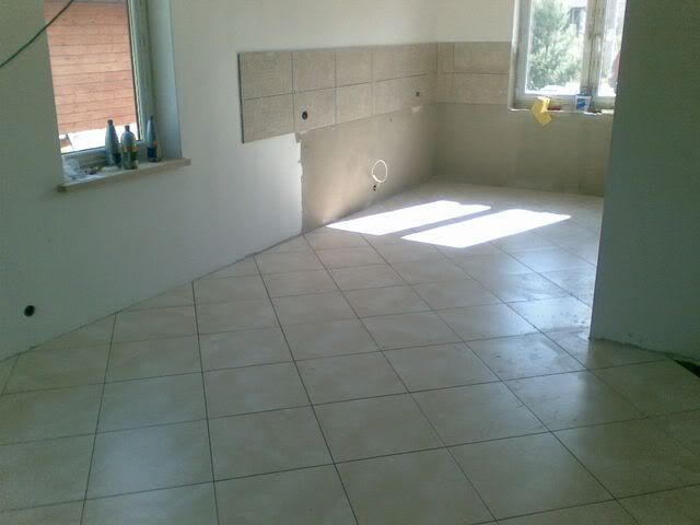 dziś Konrad ułożył gres na całym dole. Za cholerę nie wiem dlaczego Alabastrino wygląda na zdjęciach jak jakieś syfne beżyki. W rzeczywistości jst dużo bardziej białe: