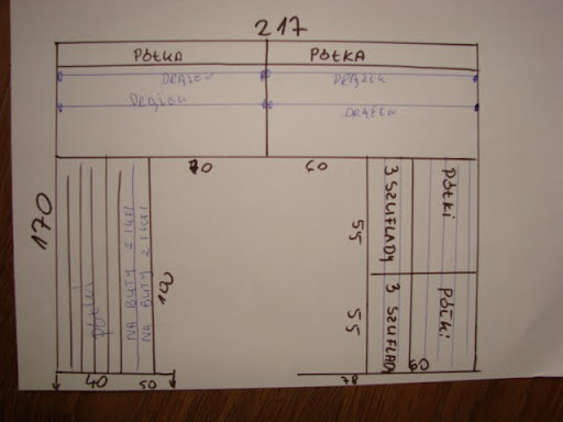 Arnika 28.10.2010 05:52 Zgłoś naruszenie Udostępnij Napisano 28 Października 2010 Malka... te czerwone to boki półek. Za półkami specjalnie są wieszaki... na te ubrania w których zbyt często nie chodzę.....Może w tym rogu niebieskim też zrobić wieszaki.... tylko trochę zwiększyć półki i z jednej i z drugiej strony... Czyli np. z 75cm na 90cm.... I może na 60cm drugą półkę... A może olać tą rogową półkę i zrobić na 40cm głęboką i na długość 160cm tak jak ściana.... A szafę z drążkiem zrobić na dwa... a w miejscu szerokiej półki 50cm zrobić jakieś długie wieszanie......Nooo nie wiem..... Cytuj Odnośnik do komentarza https://forum.murator.pl/topic/120598-komentarze-do-dziennika-arniki/page/237/#findComment-4345181 Udostępnij na innych stronach Więcej opcji udostępniania