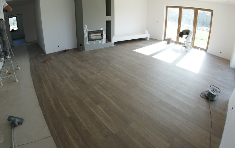 Panele to Egger - orzech laskowy z 4 stronną V-fugą, było z nimi trochę roboty, bo sprzedawane są z podkładem, który właśnie nie nadaje się na podłogówkę ale chyba tylko na elektryczną. W sklepie podkład zszedł elegancko, jak zaczęliśmy to robić w domu to nie chciał w ogóle schodzić. W końcu zrobił to jeden z naszych chłopaków od wykończeniówki i zajęło mu to 5 dni !!