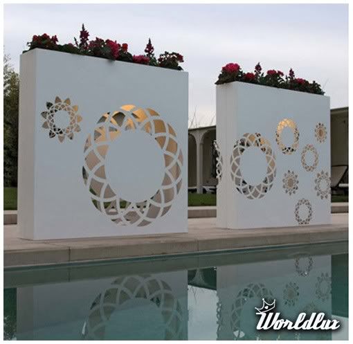 Wysokie - pole do popisu. Samemu zeby zrobic - deski najprosciej, pomalowac farba/bejca wodoodporna, latwo wzorki wyciac. Na gorze podstawka na donice w srodku. Na dole lampki wsadzic energooszedne albo solarki.