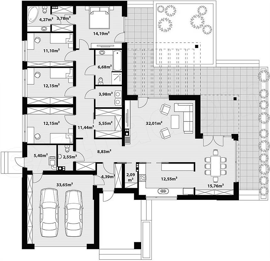 Inna rzecz, że 1 pełna łazienka i WC na 4 pokoje to tragicznie mało. 33m2 na garaż na dwa samochody to też ciasno, no chyba że na dwa Mini ;). Albo jeden samochód plus rowery, kosiarka itp.