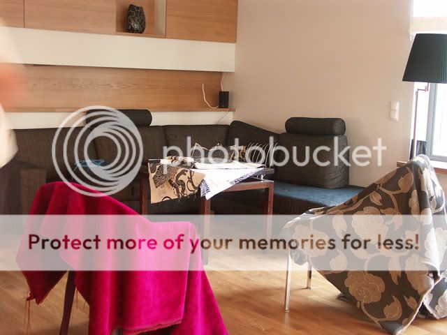 Na razie przytaszczyłam dwa fotele plastikowe z dworu i nakryłam jeden tkaniną różową a drugi szarą w róże. Poczekam, samo się wyklaruje.